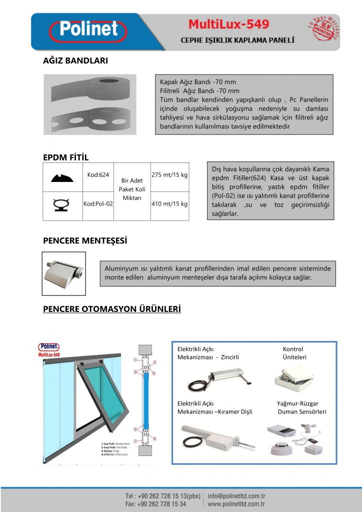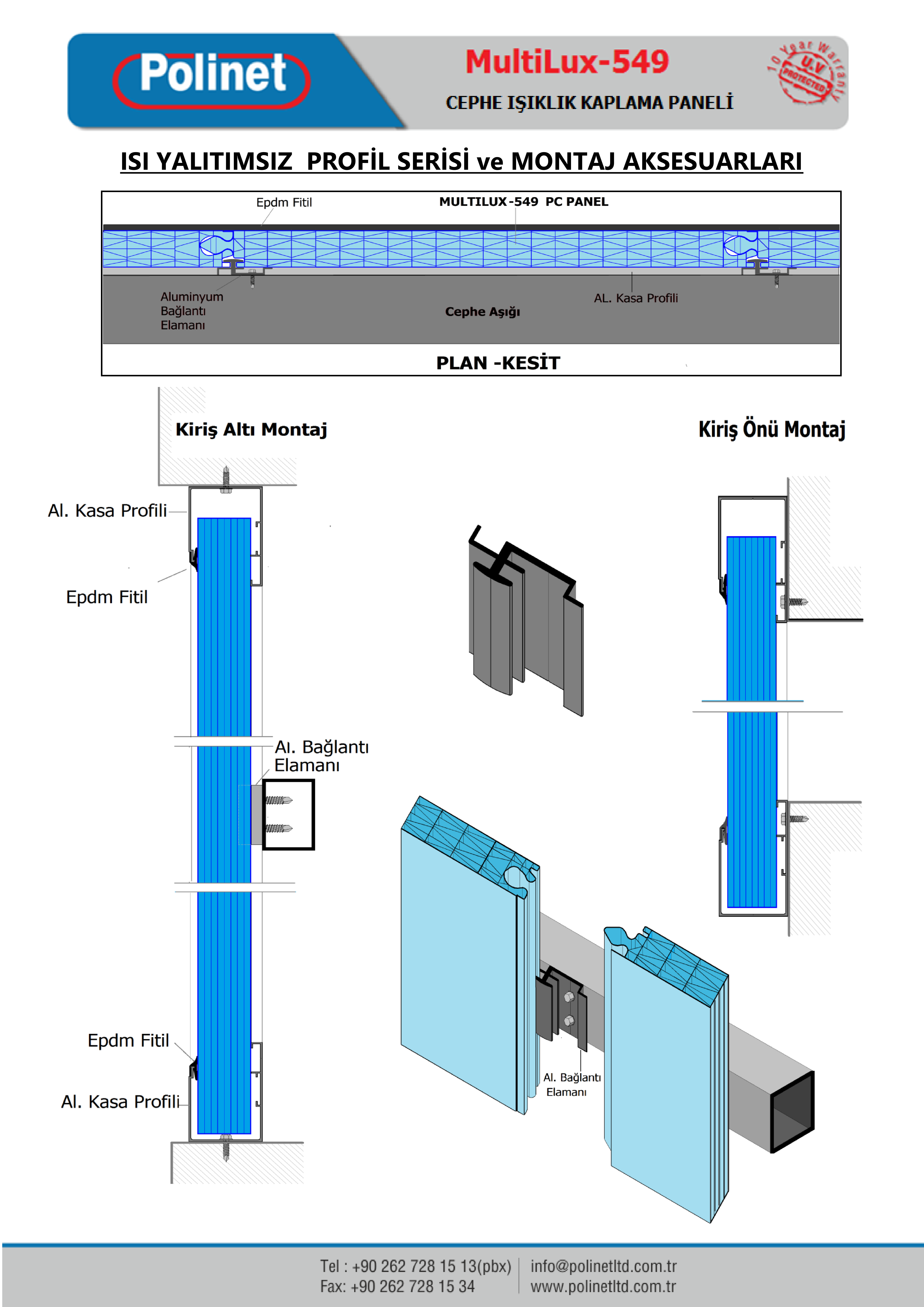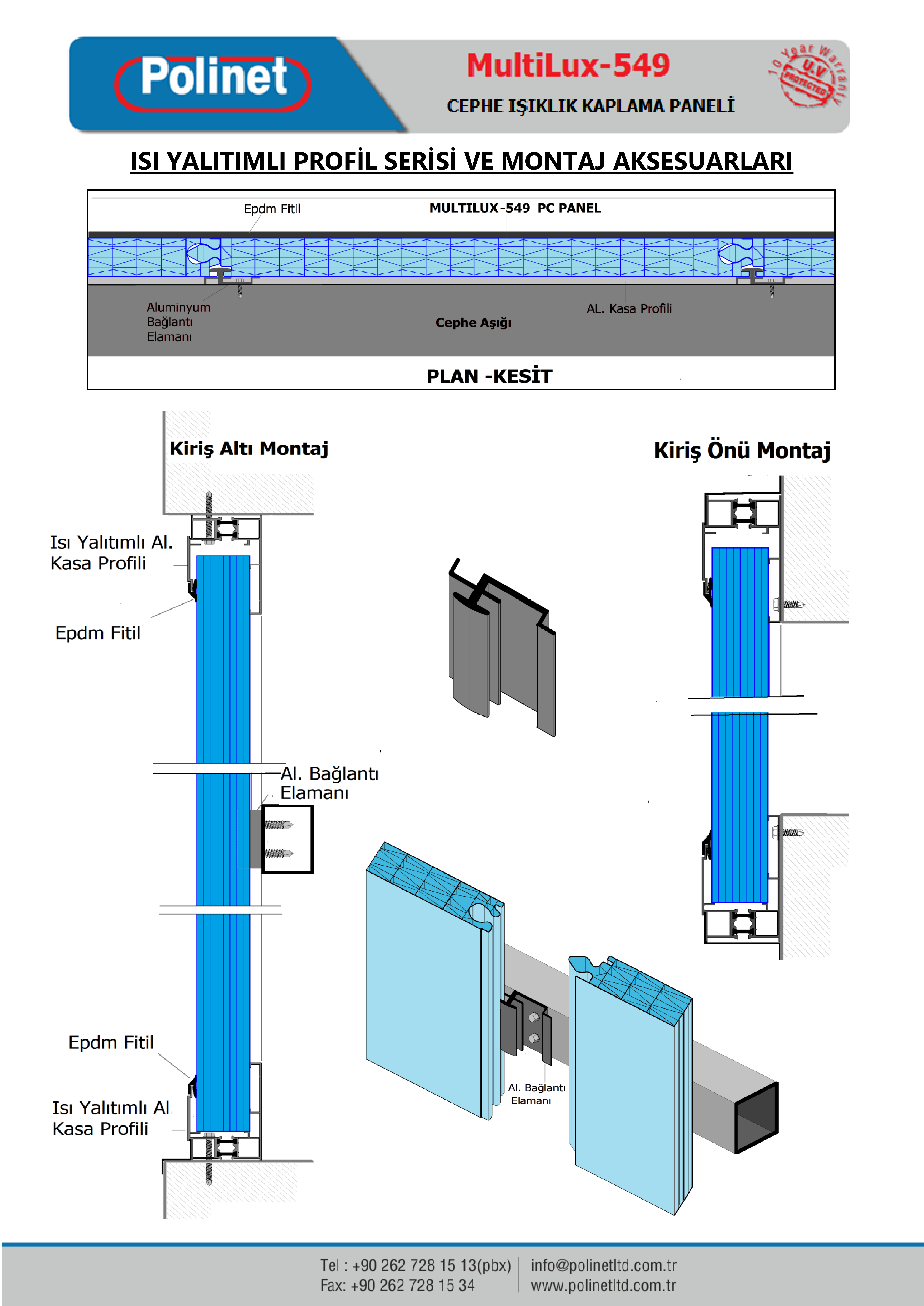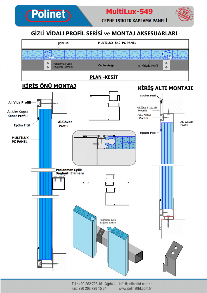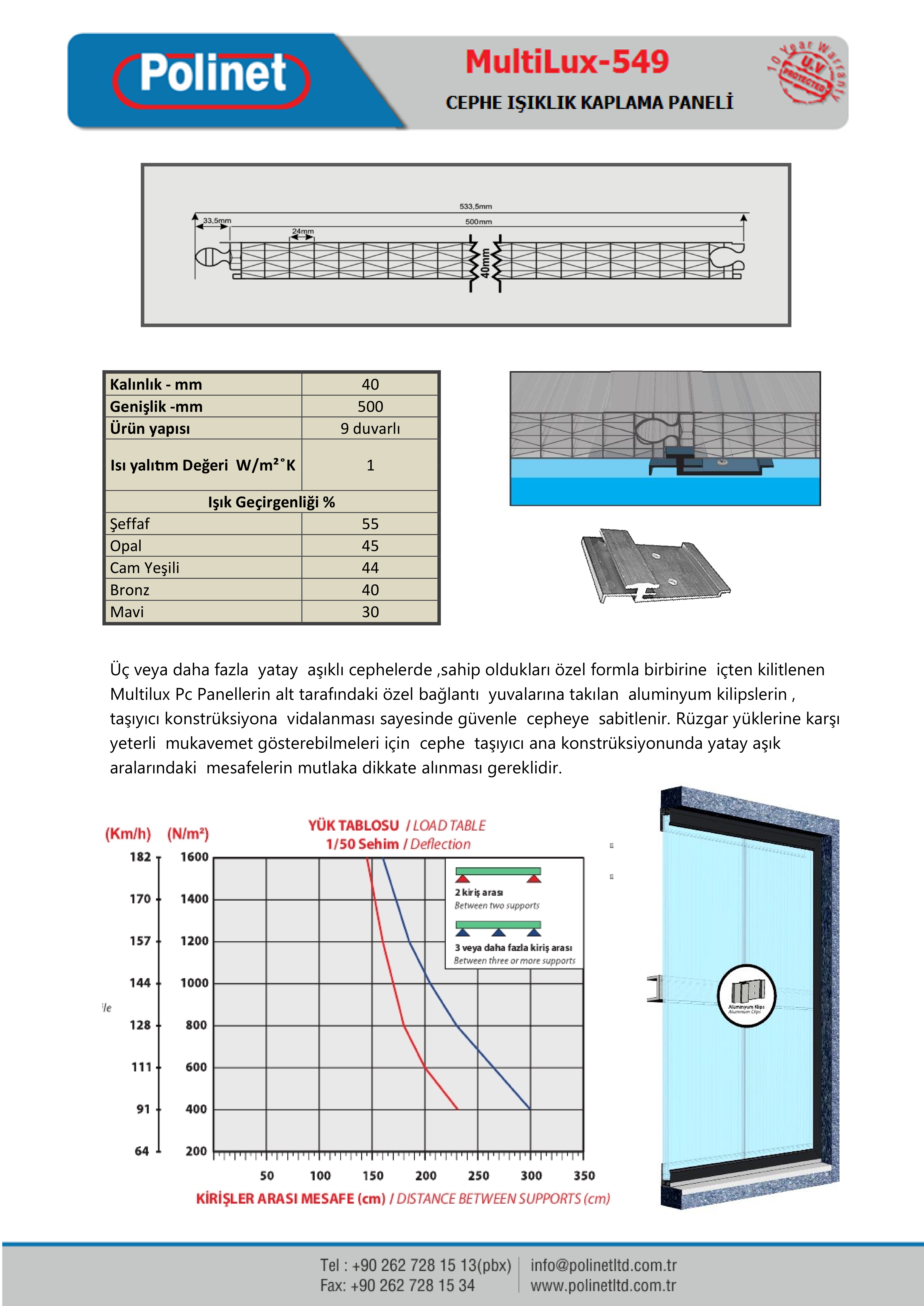 Multilux -549 dış cephe veya iç mekanlarda duvar olarak kullanılan, UV korumalı, çok iyi ışık geçirgenlik değerlerine sahip, yarı saydam modüler polikarbonat kaplama malzemesidir.